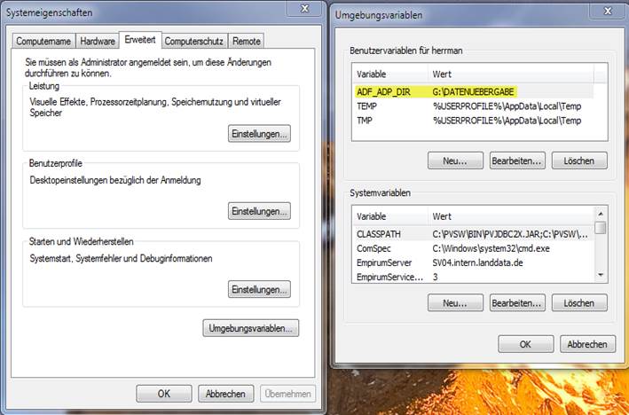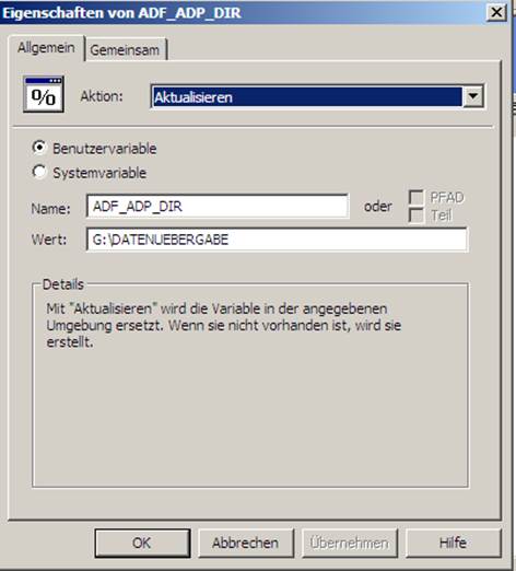 Es ist die Benutzer-Umgebungsvariable ADF_ADP_DIR einzurichten, die den Pfad des Übergabeordners enthält.