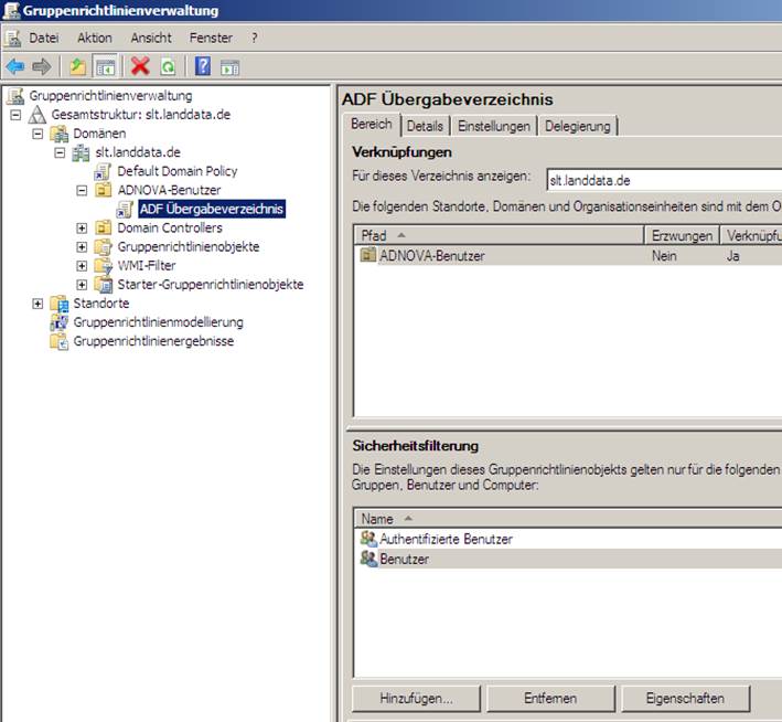 „ADNOVA-Benutzer“ mit dem Gruppenrichtlinienobjekt „ADF Übergabeverzeichnis“ verknüpfen.