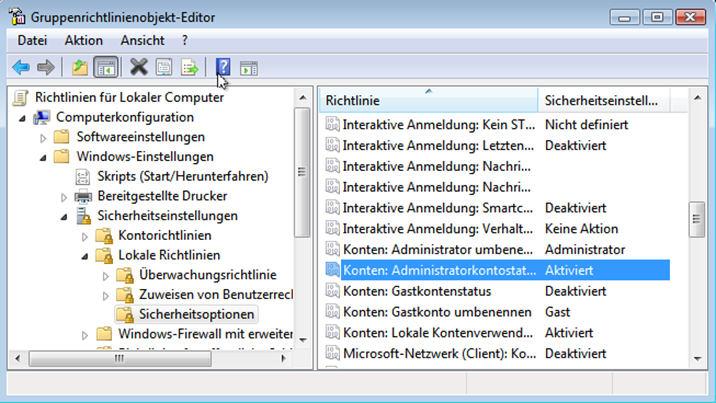 - Managementkonsole gestartet bzw. „gpedit.msc“ ausgeführt und den Administratorkontostatus auf aktiviert gesetzt.