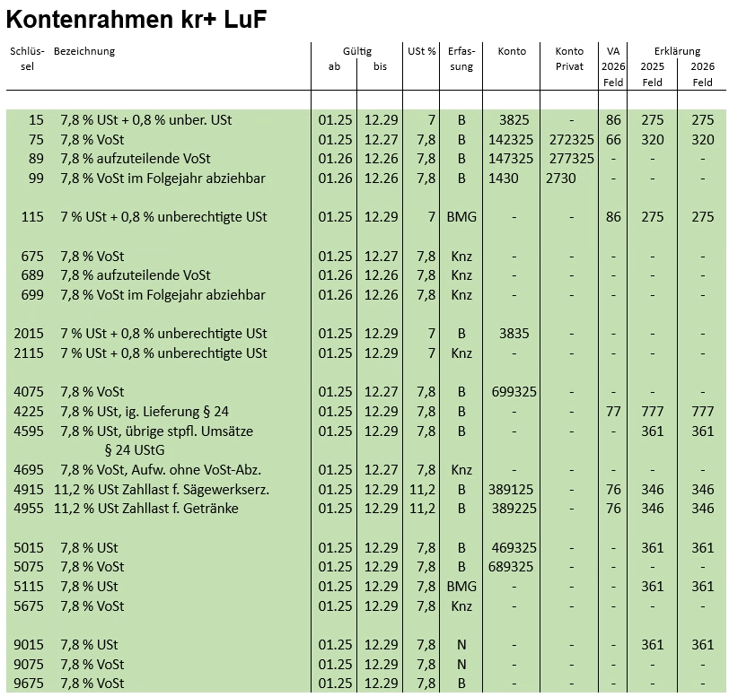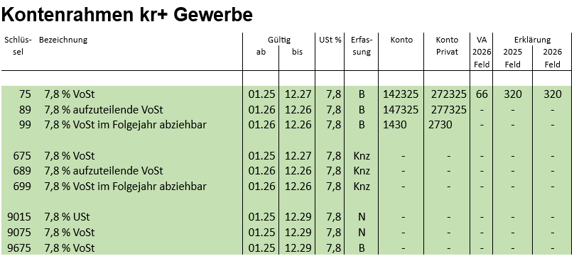 Die USt-Schlüssel für den aktuellen pauschalen Steuersatz z.B. 3, 63, 4063, 4583 usw. sind daher vorerst weiterhin mit 7,8 % eingerichtet. Die Gültigkeit werden wir monatlich verlängern.